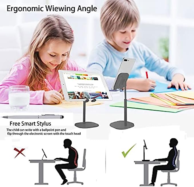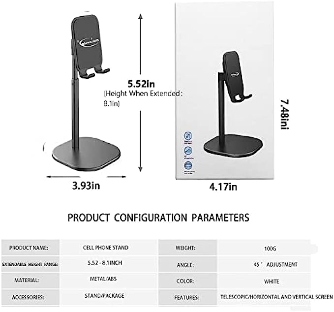 【Weighted Anti-slip Base】This cell phone stand for desk comes with sturdy and smooth aluminum posts and a stable weighted base with non-slip silicone pads. Rubber feet under the base make it more stable when you tap the device. Therefore, the iPhone stand holder can support any smartphone or small tablet.