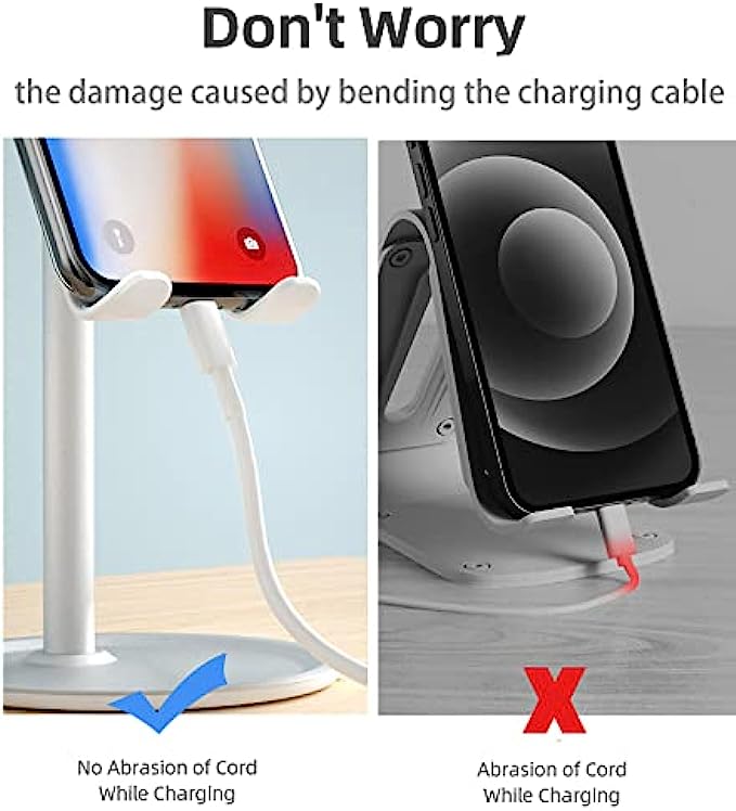 【User-Friendly Design】The adjustable desktop phone holder has reserved charging holes, which will not affect the charging when using this mobile phone stand. Whether you place the device on the stand horizontally or vertically, it will not cover the screen.