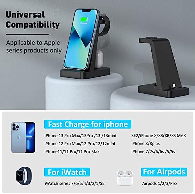 Better Compatibility: Our multifunctional charging stand has greater compatibility than general wireless charger. It is not only compatible with Apple Watch wireless charging, but also compatible with all iphone series. It is compatible with iPhone 13/13 Pro/13 Pro Max/13 mini/12/12 Pro/12 Pro Max/12 mini/11/11 Pro/11 Pro Max/XS/XR/XS MAX/X/8/8Plus/7/7s/6/6s /5/5s & Apple iWatch 7/6/5/4/3/2/1/SE & AirPods 1/2/3/Pro. (Note: only for Apple products).