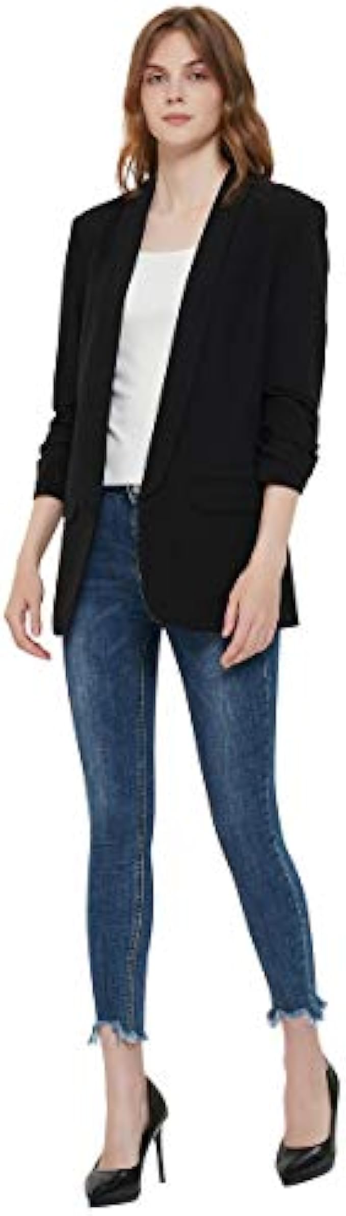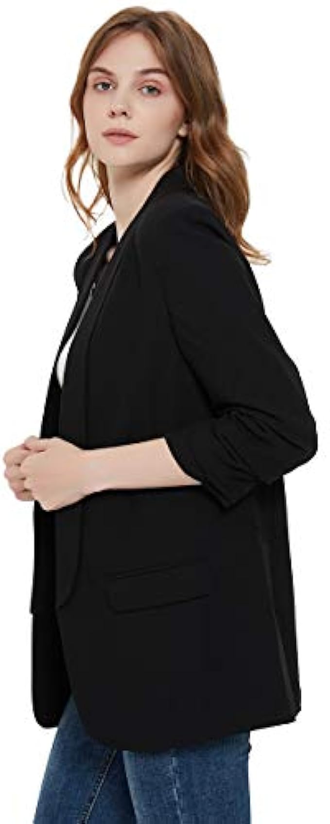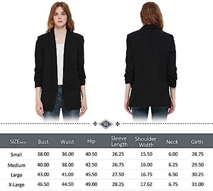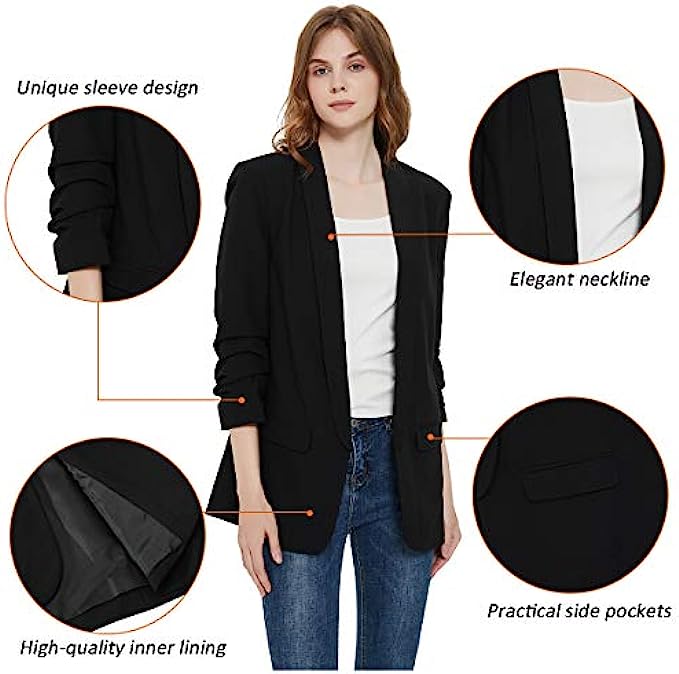 • Black blazer for women casual blazer , padded shoulder, lapel collar, open front slim fit 3/4 wrinkled sleeves and regular length.