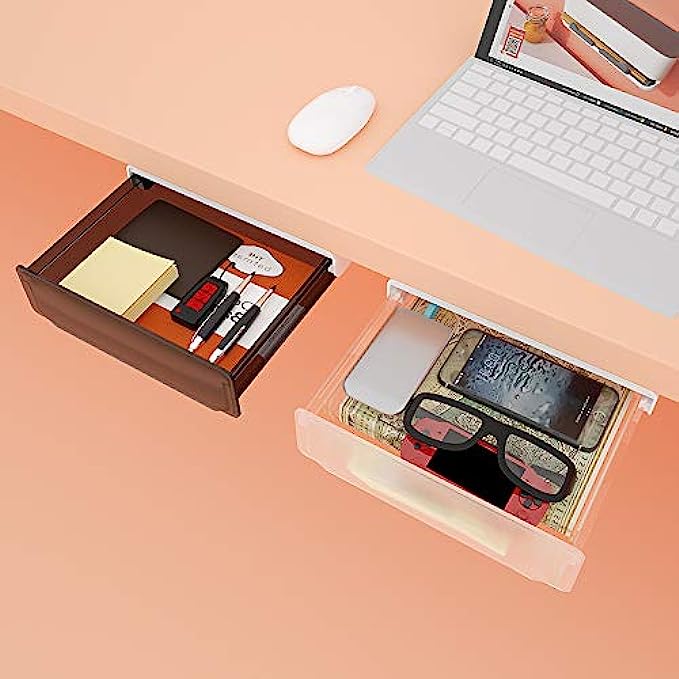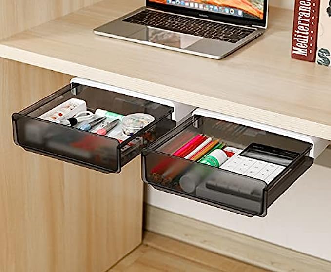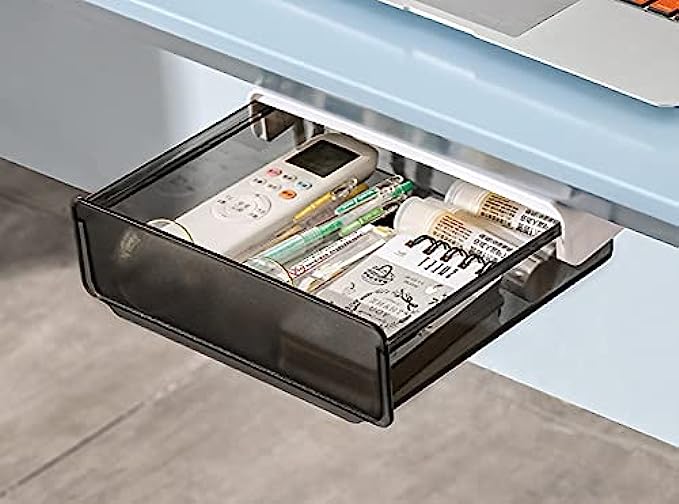 ✅ ORGANIZE THE DESKTOP : This hidden drawer storage will hold quite a lot of office supplies such as pencil, airpods, charger, notebook, sticky note, tissues and etc. Organize your desktop especially suitable for standing desk without drawer